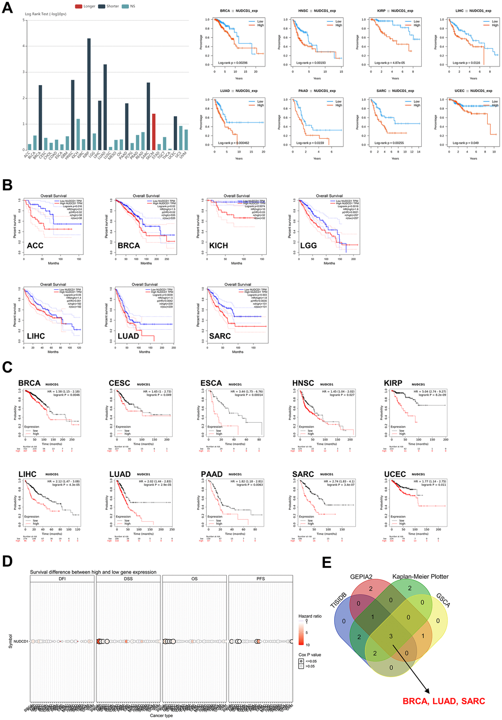 NUDCD1 is aberrantly expressed in numerous tumor tissues and cells so we also explored the prognostic relevance of NUDCD1 in cancers. First, analyses based on TISIDB revealed that high expression of NUDCD1 indicated a shorter OS (overall survival) in 8 types of cancers (Figure 3A). Data from GEPIA2 suggested that NUDCD1 expression was correlated with OS in 7 types of cancers (Figure 3B). Moreover, Kaplan-Meier Plotter (KM Plotter) was used to draw overall survival curves of cancer patients (Figure 3C) and the OS from GSCA indicated distinct survival differences between high and low NUDCD1 expression groups in multiple cancers (Figure 3D). The combined results of above 4 databases indicated that in BRCA, LUAD and SARC (Sarcoma), increased expression of NUDCD1 predicted a poor overall survival (Figure 3E).