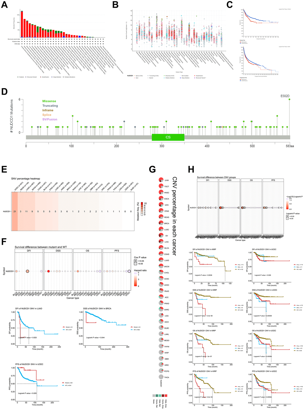 A total of 103 mutation sites for the gene were identified, including 80 missense, 16 truncations, 2 splice and 5 fusion mutations between codons 1 and 583 (Figure 4D). In addition, “Single Nucleotide Variation” (SNV) (Supplementary Figure 8B) and “Copy Number Variation” (CNV) (Supplementary Figure 8C, 8D) were found that included 32 cancer types. There were also significant correlations of NUDCD1 CNV with its mRNA expression in most types of cancers with the exception of THCA, LAML and DLBC (Supplementary Figure 8E). The SNV percentage heatmap and CNV percentage in each cancer was displayed in Figure 4E, 4G, respectively. The highest SNV mutation frequency of NUDCD1 (21%) appeared in patients with UCEC while there were none found for patients with CESC and DLBC (Figure 4E). Survival differences between mutant and WT for SNV indicated a significantly worse DFI profile for LUAD, DSS in BRCA and PFS in UCEC (Figure 4F). Moreover, in KIRP and UCEC, NUDCD1 CNV was significantly worse for DFI, DSS, OS and PFS (Figure 4H).