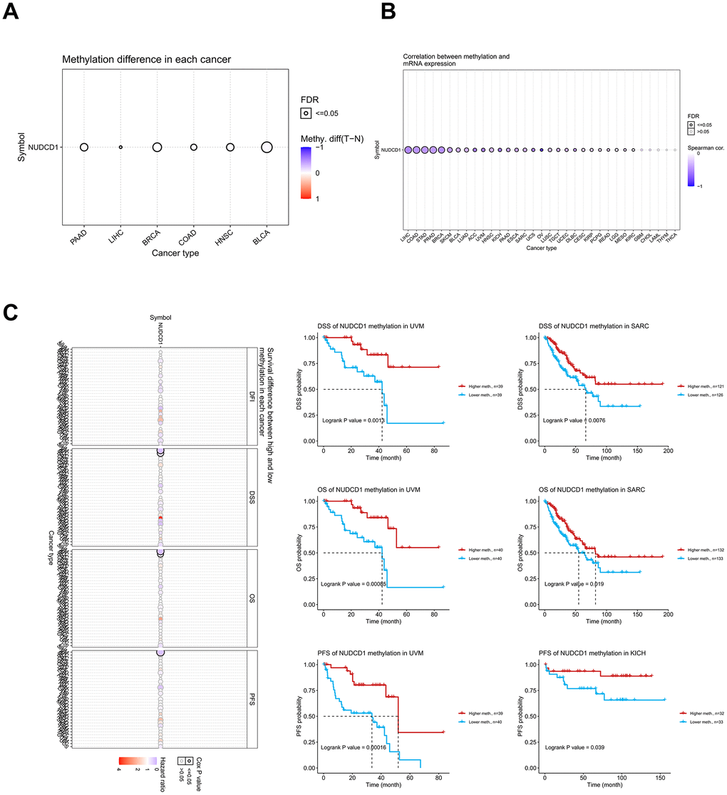 Methylation differences between tumor and normal samples of NUDCD1 across different cancer types from TCGA was analyzed by the “mutations” module of GSCA using the thresholds >10 pairs of tumor-normal samples and p-value≤0.05. The GSCA web server was also used to summarize correlation profiles between methylation and NUDCD1 mRNA expression in specific cancers. The “mutations” module of GSCA was used to analyze survival differences (DFI, DSS, OS, and PFS) between cancer patients with high and low methylation level of NUDCD1.