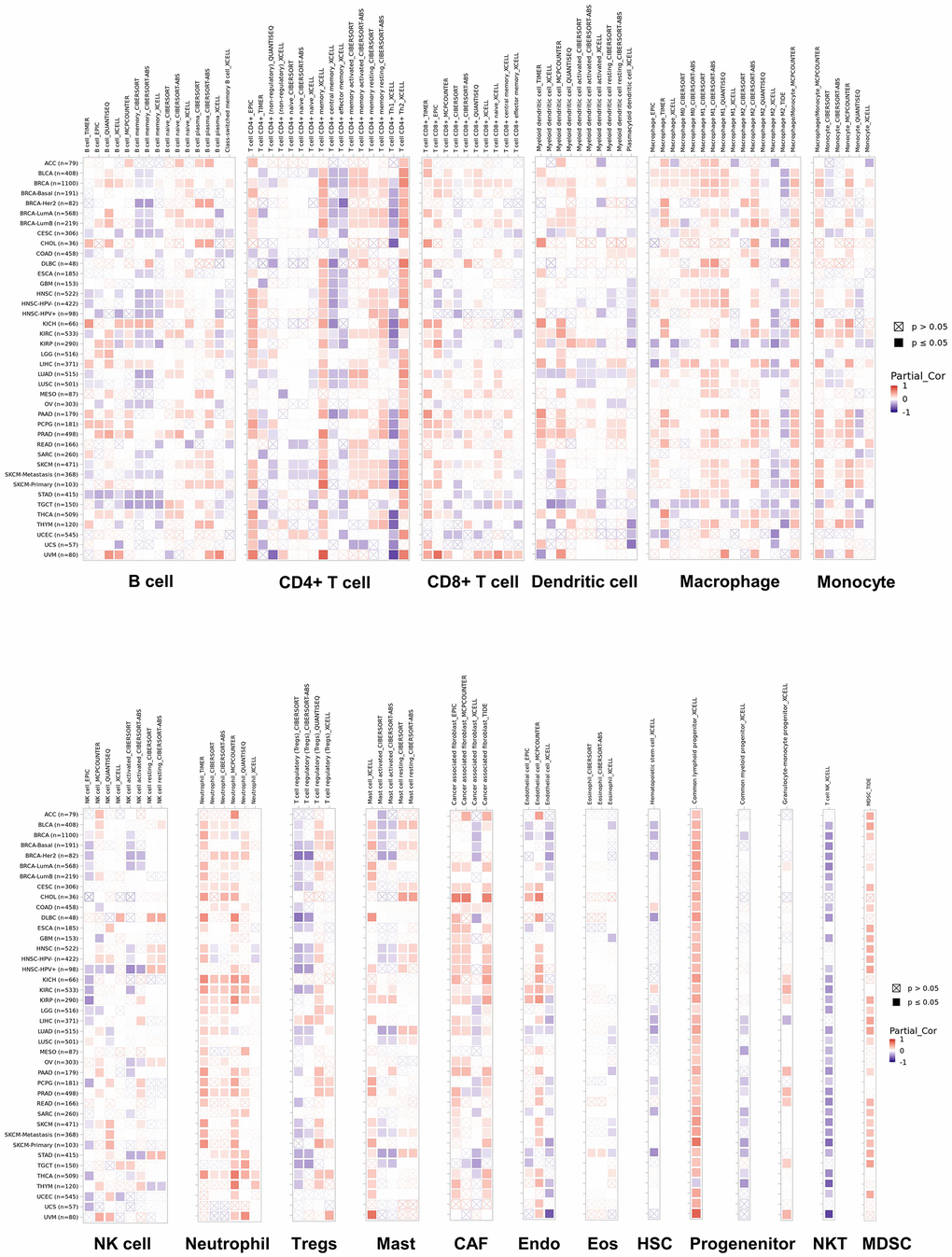 The “Gene module” in TIMER2 allowed us to visualize correlations between NUDCD1 expression with immune infiltration in numerous and diverse cancer types. The NUDCD1 and immune infiltrates information was converted to heatmaps to show the purity-adjusted Spearman's rho coefficients across various cancer types. We also assessed correlations of NUDCD1 with markers for immune cell subsets including CD8+ T cells, total T cells, B cells, monocytes, tumor-associated macrophages (TAMs), M1 and M2 macrophages, neutrophils, NK cells, DCs, Th1 cells type 2 helper T cell (Th2), Tfh cells, type 17 helper T cell (Th17), Tregs and exhausted T cells.