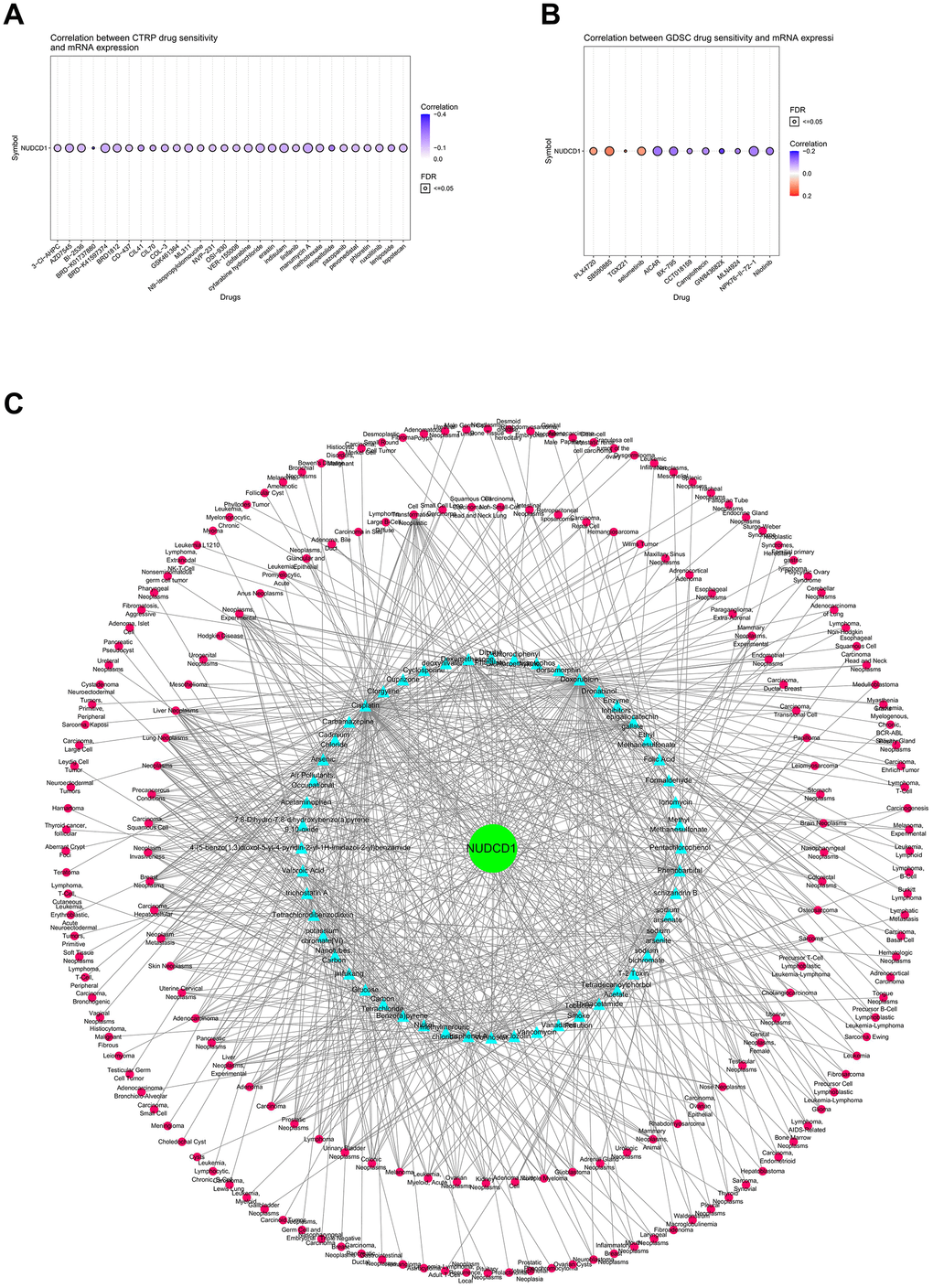 Correlations between NUDCD1 expression and drug sensitivity in cancers