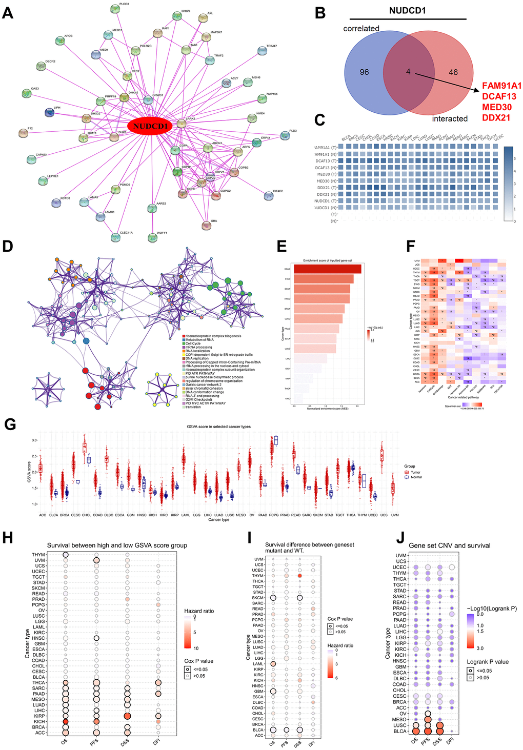 Protein expression analysis of NUDCD1 was conducted using the CPTAC (Clinical Proteomic Tumor Analysis Consortium) dataset in UALCAN (The University of ALabama at Birmingham CANcer data analysis Portal) portal (http://ualcan.path.uab.edu/analysis-prot.html) [42]. From Gene Set Cancer Analysis (GSCA) platform (http://bioinfo.life.hust.edu.cn/GSCA/#/) [43], gene enrichment across pan-cancers was based on gene set enrichment analysis (GSEA) scores of NUDCD1 and associations between pathway activity and NUDCD1 expression scores were compiled using gene set variation analysis (GSVA).