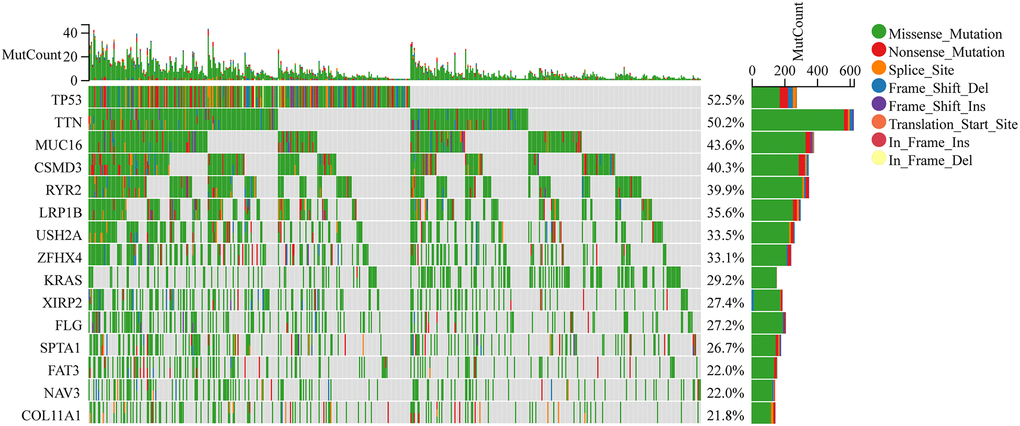 Traditional decision-making in LC treatment is based on histological considerations. Over the past several years, treatment selection has greatly changed owing to a better understanding of tumor biology and the identification of further genetic alterations. The present research focused on identifying somatic mutations in LUAD cases. Based on TCGA data, the MUC16 mutation ranks third among all commonly occurring mutations in LUAD in terms of its occurrence frequency (Figure 1).