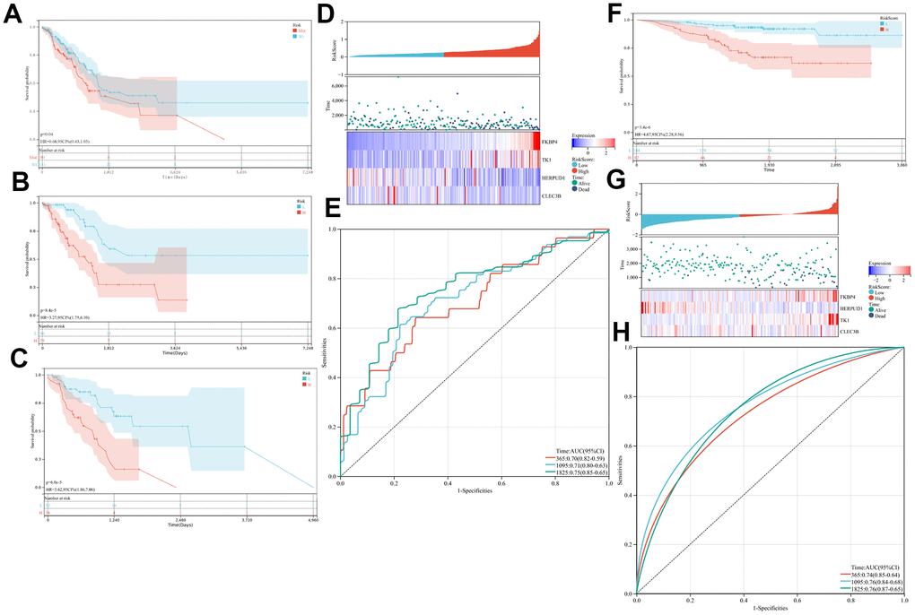 Conforming to the four-gene nomogram’s prognosis predictability, MUC16 mutation status showed a close relationship with the prognostic outcome in LUAD cases harboring mutation (Figure 3A). To investigate whether this four-gene signature, which includes thymidine kinase 1 (TK1), FK506-binding protein 4 (FKBP4), C-type lectin domain family 3, member B (CLEC3B) and homocysteine-inducible, endoplasmic reticulum stress-inducible, ubiquitin-like domain member 1 (HERPUD1), exhibited independence from MUC16 mutation status, LUAD cases were classified as low- and high-risk groups according to MUC16 mutation status. The KM OS curves for both groups, according to the constructed four-gene signature showed a significant difference between the MUC16WT and MUC16MUT LUAD data sets (Figure 3B, 3C). Gene expression data and risk score distribution are shown in Figure 3D, 3E shows the predictability of the as-constructed IPM based on t-ROC curves. The AUC values for the OS of our constructed model were 0.7, 0.71, and 0.75 for 1-, 3-, and 5-year survival, respectively.