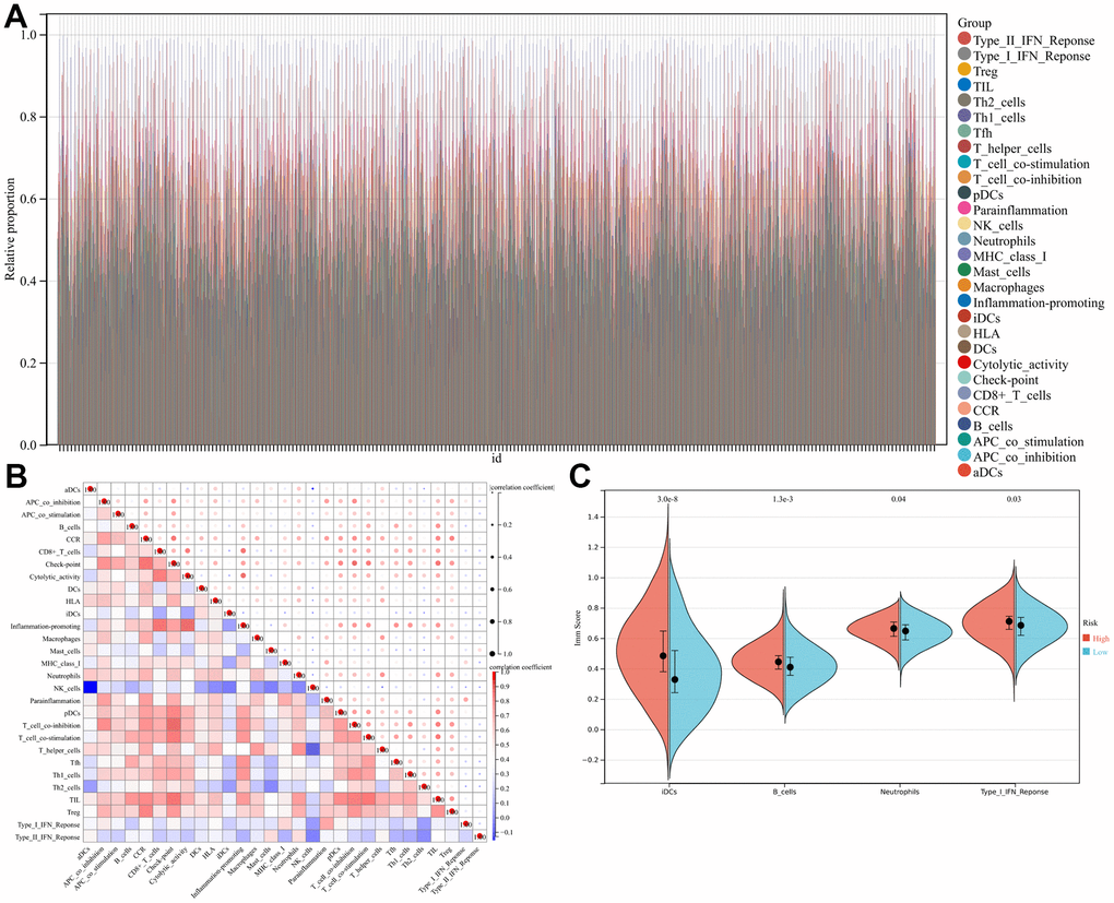Different TIIC levels were analyzed in low- and high-risk LUAD cases. As shown in Figure 4A, the abundance of 29 TIICs showed significant differences in low- and high-risk LUAD cases. Additionally, changes in TIIC abundances possibly represented the inherent characteristic featuring individual heterogeneities. The abundance of diverse TIICs showed weak-to-moderate correlation (Figure 4B). High-risk LUAD cases showed an increased abundance of neutrophils, B-cells, immature DCs (iDCs), and type I interferon (IFN) T-cell response (Figure 4C). Different TIIC abundances seen in LUAD can serve as prognostic, predictive factors and immunotherapeutic targets, which are of great clinical significance.