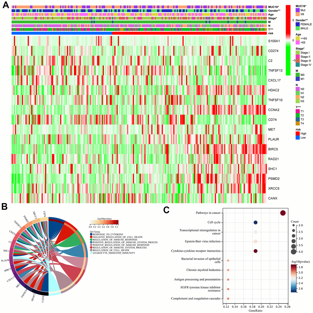 The present research is the first to identify IRGs impacted by MUC16 mutation, which may provide new biomarkers to predict the prognosis and treatment of LUAD. MUC16 mutation cases were associated with dismal prognosis. Moreover, MUC16 mutation–related genes were significantly associated with immune response-related GO terms. Additionally, the four-gene IPM was constructed for predicting the LUAD prognostic outcome. According to the median risk score, LUAD cases were classified as high- and low-risk LUAD cases, with high-risk cases showing dismal OS.