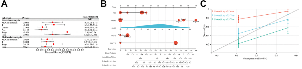 The independence of the constructed risk score from traditional clinical factors was assessed based on the constructed four-gene IPM. The results of the univariate Cox regression analysis showed that MUC16 mutation status, risk score, T stage, and TNM stage predicted the dismal prognostic outcome of LUAD cases. In multivariate Cox regression analysis, the four aforementioned factors were identified as independent prognostic factors for LUAD (p < 0.05; Figure 7A). Furthermore, a prognostic nomogram was constructed based on the factors significant in multivariate regression. Relative to T stage and TNM stage, risk score exhibited better predictability (Figure 7B). As shown in the calibration plot, the bias-corrected line was close to the optimal curve (the 45-degree line), indicating high consistency between the predicted and observed values (Figure 7C).