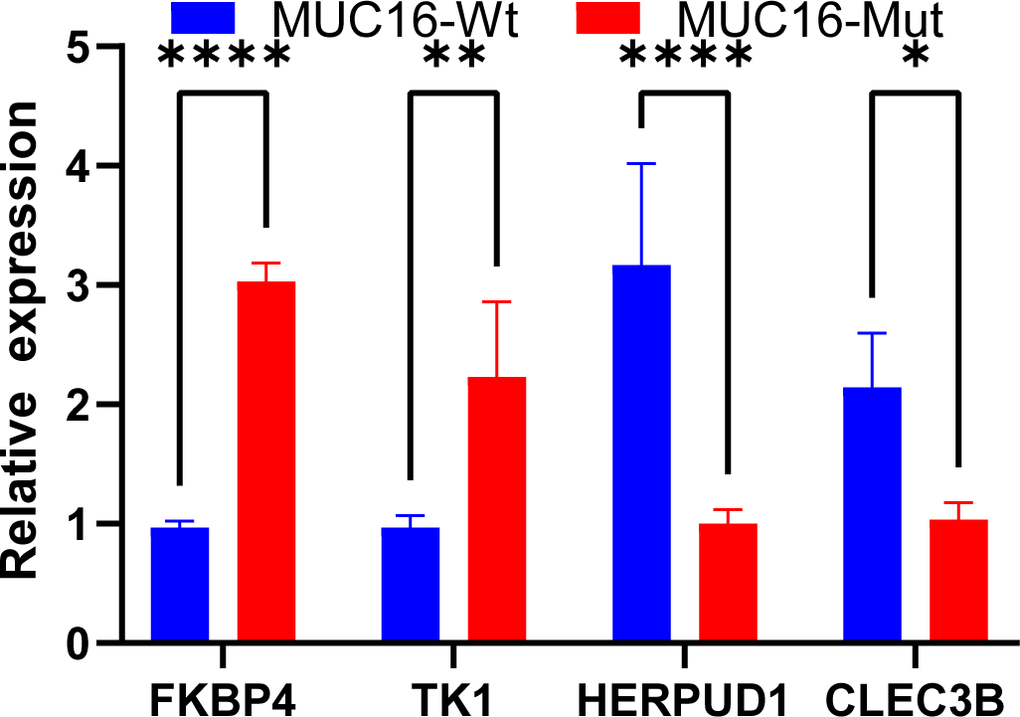 FKBP4, TK1, HERPUD1, and CLEC3B levels were measured and verified in clinical samples (tumor tissues). FKBP4 and TK1 protein expression markedly increased in MUC16 mutation tissue samples relative to that in their non-mutation counterparts. HERPUD1 and CLEC3B expression showed a contrary trend. These findings confirmed that our results were reliable.