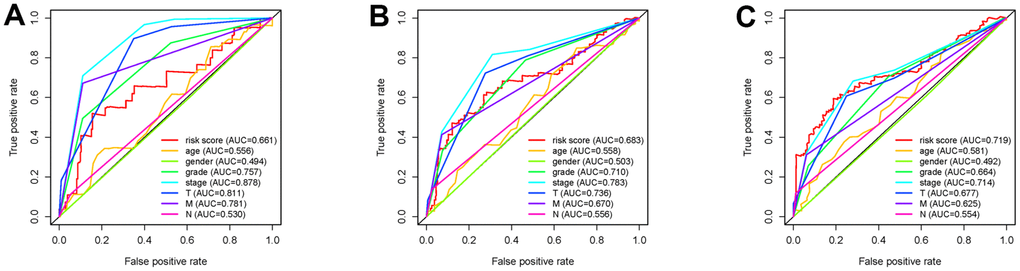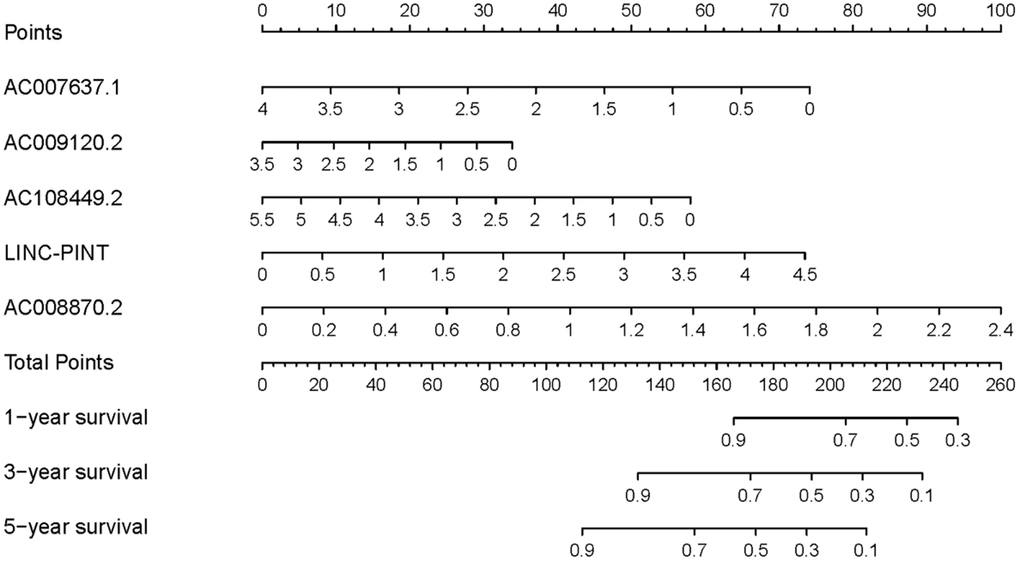 To investigate the association of sSR-LncRs with clinicopathologic features (e.g., grade, stage, TNM-stage) of ccRCC patients, we used the ggpubr package and discovered that LINC-PINT was highly expressed in ccRCC patients with advanced stage, T-stage and M-stage (Figure 4A–4E). However, the expressions of AC108449.2 and AC007637.1 were decreased in advanced grade, stage, T-stage and M-stage (Figure 4A–4E). Subsequently, we applied multivariate analysis to identify potential independent risk factors for ccRCC patients, and the results suggested that age and the risk score could be used as independent predictors of ccRCC patients (Figure 5). Next, we figured up the AUCs for ROC curves of SRSM and clinical characters to test the accuracy of SRSM, and found that the AUCs of risk scores were 0.661, 0.683 and 0.719 for 1, 3 and 5 years, respectively (Figure 6). Finally, we normalized the number of SRSM points from 0 to 100, and plotted the sSR-LncRs expression level line between the total point axis and each prognostic axis (Figure 7). These results suggested that SRSM could be used as a risk factor for predicting the prognosis of ccRCC patients.