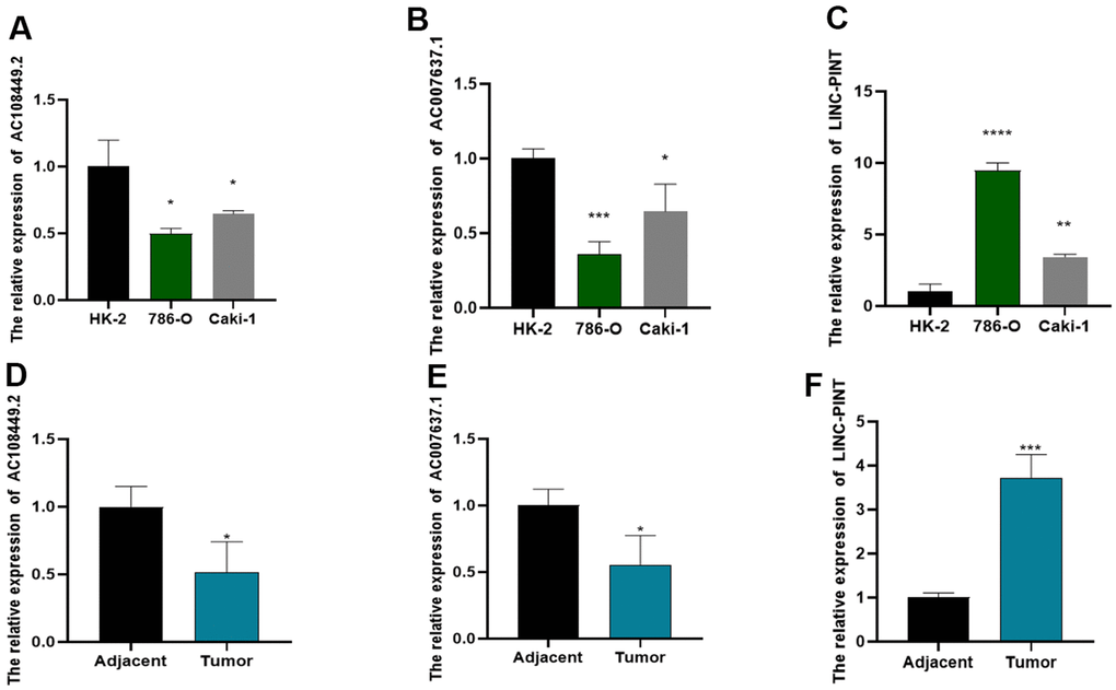 Subsequently, we determined the expression of LINC-PINT, AC108449.2 and AC007637.1 in ccRCC tissues and cell lines. As shown in Figure 8A–8C, the expression level of LINC-PINT was significantly higher in tumor tissues than in adjacent normal tissues, but AC108449.2 and AC007637.1 were contrary. Similarly, the expression level of LINC-PINT in ccRCC cell line 786-O and Caki-1 was also higher than that in HK-2, but AC108449.2 and AC007637.1 were decreased in ccRCC cell lines. In addition, we found that LINC-PINT was highly expressed in the ccRCC tumor tissues, while the expressions of AC108449.2 and AC007637.1 were higher in adjacent normal tissues than that in ccRCC tissues (Figure 8D–8F).