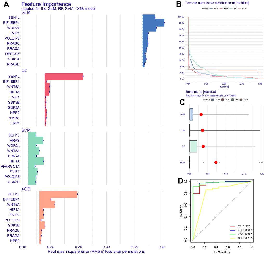 The mTOR signaling pathway has been extensively studied in GC. Studies have found that GLI can mediate mTOR-induced PD-L1 expression in GC cells [9]. Salidroside induces apoptosis and protective autophagy in GC cells through the PI3K/Akt/mTOR pathway [10]. CircNRIP1 promotes GC progression through the microRNA-149-5p/AKT1/mTOR pathway [11]. Cynaroside promotes cell proliferation, apoptosis, migration, and invasion through the MET/AKT/mTOR axis [12]. The mTOR signaling pathway is also closely related to aging. SHQA inhibits oxidative stress-induced aging and replication by inhibiting the Akt/mTOR pathway [13]. Erythromycin improves oxidative stress-induced cell aging through the PI3K-mTOR signaling pathway in chronic obstructive pulmonary disease [14]. Currently, there are many different perspectives on building machine learning models related to GC, but no model has been proposed from the perspective of the mTOR signaling pathway. We are the first to propose this model in GC research.