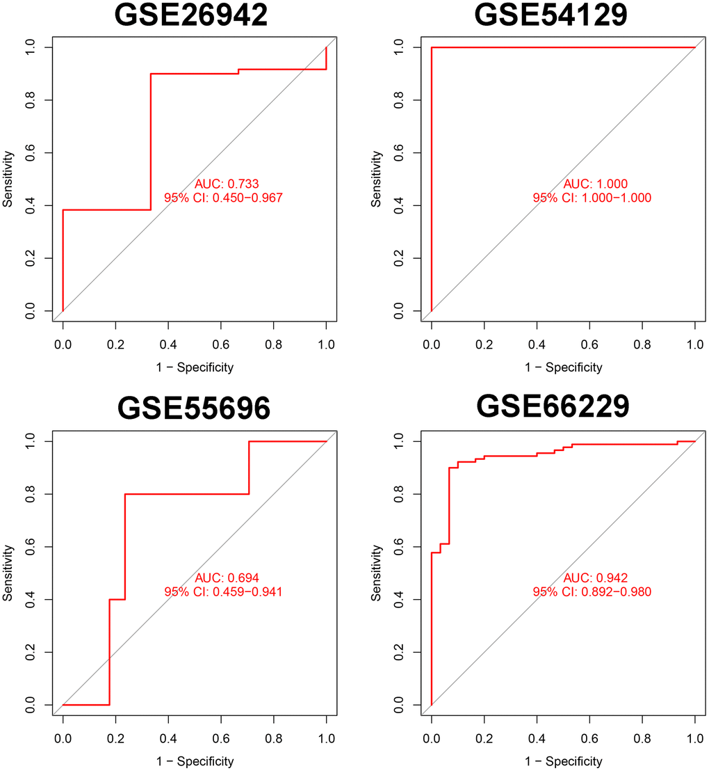Validation of the reliability of the SVM model in the GSE26942, GSE54129, GSE55696, and GSE66229 cohorts
