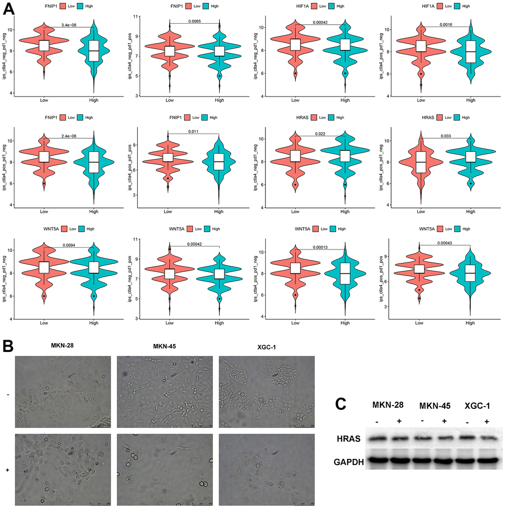 We analyzed the sensitivity of these 5 genes to immunotherapy and found that patients with low expression of FNIP1 and WNT5A were more sensitive to CTLA4, PD1, and combination therapy, while patients with low expression of HIF1A were more sensitive to CTLA4. Patients with high expression of HRAS were more sensitive to CTLA4. The expression level of PPARA showed no significant difference in response to CTLA4 and PD1 treatment (Figure 4A). Treatment with bleomycin induced cellular senescence in three types of GC cells, and the expression level of HRAS was significantly decreased in senescent cells (Figure 4B, 4C).