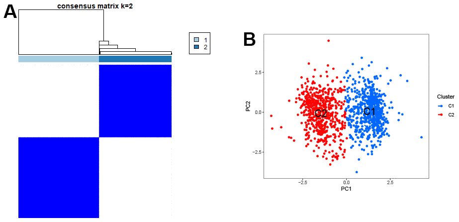 The samples were clustered using the “ConsensusClusterPlus” and “limma” packages. The bar plot of GSVA was performed using the “reshape2”, “ggpubr”, “limma”, “GSEABase”, and “GSVA” packages. The box plot of drug sensitivity was performed using the “car”, “ridge”, “preprocessCore”, “genefilter”, and “sva” packages.
