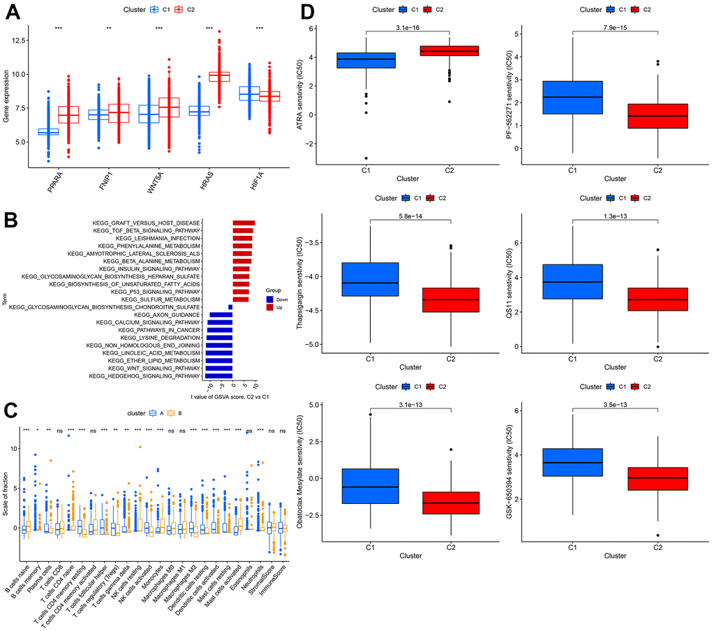 The expression levels of WNT5A, FNIP1, PPARA, and HRAS were significantly higher in cluster 1 than in cluster 2, while the expression of HIF1A was lower in cluster 1 than in cluster 2 (Figure 6A). Using GSVA analysis, we found that GRAFT_VERSUS_HOST_DISEASE was the most significant pathway in cluster 2, while HEDGEHOG_SIGNALING_PATHWAY was the most significant pathway in cluster 1 (Figure 6B). We estimated the immune cell content and immune scores for the 1240 samples. Most immune cells showed significant differences between the two clusters, but there were no significant differences in T cells CD8, T cells CD4 memory activated, Macrophages M0, Macrophages M1, Eosinophils, Neutrophils, StromalScore, ImmuneScore (Figure 6C). We also calculated the sensitivity of the two clusters to different drugs and presented the top 6 drugs with the most significant differences, showing that patients in cluster 2 were more sensitive to these 5 drugs than those in cluster 1 (Figure 6D).