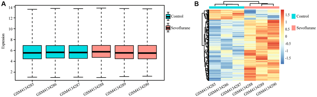A total of 10032 unique genes were annotated with the SwissProt database. The expression boxplot of all genes for each sample is shown in Figure 1A after normalization with the rma function by using the oligo package. The differential expression analysis identified 194 upregulated and 32 downregulated genes after treatment with 2.5% sevoflurane in 100% oxygen for 4 hours in an anesthetizing chamber with the criterion of a P value less than 0.05. Among all DEGs, 160 DEGs (153 upregulated DEGs and 17 downregulated DEGs) could be annotated in metascape, they were listed in Table 1, and the heatmap of the DEGs between the two groups is displayed in Figure 1B.