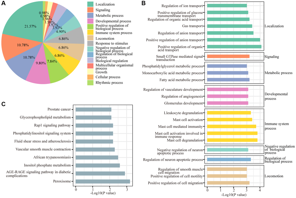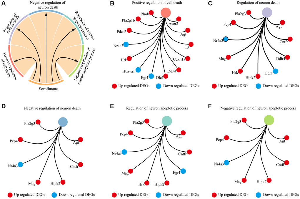Biological processes and KEGG annotation were applied to explore the function of DEGs. All DEGs significantly played a role in localization, signaling, metabolic process, development process, and positive regulation of biological process (Figure 2A). Twenty-four biological process terms were filtered with P value less than 0.001, and DEGs were significantly enriched in the regulation of neuronal apoptosis (Figure 2B). Next, we screened the biological processes associated with neuron death with the key words neuron and death, and 5 biological processes (positive regulation of cell death, regulation of neuron death, negative regulation of neuron death, regulation of neuron apoptotic process and negative regulation of neuron apoptotic process) were dysregulated by sevoflurane (Figure 3A). Most of the genes enriched in disordered biological processes associated with cell death were upregulated after sevoflurane inhalation (Figure 3B–3F). A total of 10 KEGG pathways, such as peroxisome, AGE-RAGE signaling pathway in diabetic complications, inositol phosphate metabolism, vascular smooth muscle contraction, rap1 signaling pathway, and glycerophospholipid metabolism, were enriched by DEGs (Figure 2C).