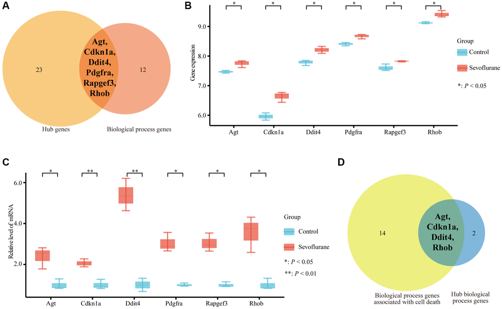 A total of 57 nodes and 97 interactions of the DEGs were identified in STRING and were visualized in Cytoscape (Figure 4). We calculated the number of genes enriched in biological process terms, and the genes that were enriched in at least 10 terms are listed in Table 2. The cytoHubba application identified 58 hub genes with 12 algorithms, including 29 genes that were identified by at least five different methods as candidate hub genes (Table 3). Six hub genes (Agt, Cdkn1a, Ddit4, Pdgfra, Rapgef3, and Rhob) were both selected with two methods (Figure 5A). The six hub genes were upregulated after sevoflurane inhalation (Figure 5B). We further validated the expression of the six hub genes in vivo. We found that 4 h of 3% sevoflurane treatment increased the mRNA levels of Agt, Cdkn1a, Ddit4, Pdgfra, Rapgef3, and Rhob in the mouse hippocampus (Figure 5C). Among the 6 hub genes, 4 genes (Agt, Cdkn1a, Ddit4, and Rhob) were also enriched in biological processes associated with neuronal death (Figure 5D).