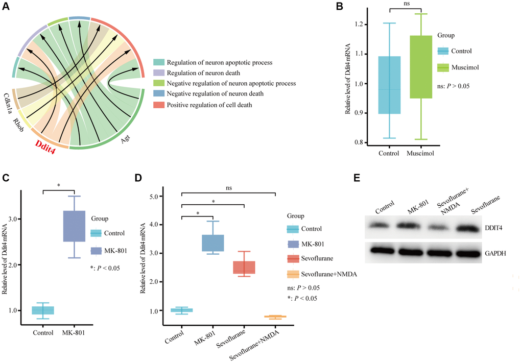 DDIT4, an encoded protein that regulates development and DNA damage and participates in various pathological processes, was significantly enriched in the regulation of neuron death and positive regulation of cell death (Figure 6A). NMDAR and GABAAR are considered important targets of sevoflurane [36–38]. Therefore, we further explored whether DDIT4 is regulated by NMDAR or GABAAR. We found that activation of GABAAR by injection of the GABAAR agonist muscimol (1.25 μg) into the mouse hippocampus did not cause a significant change in Ddit4 expression (Figure 6B). However, after injection of the NMDAR antagonist MK-801 (0.25 μg) into the mouse hippocampus (injection coordinates: AP −2.1 mm, ML 1.5 mm, DV −2.1 mm) by brain stereotactic injection, the mRNA expression of Ddit4 was increased (Figure 6C).