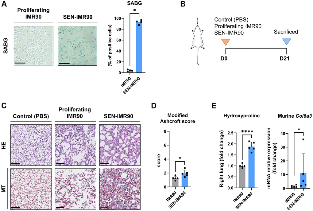As a cellular model, we used human lung fibroblasts (IMR90), which is a normal diploid non-immortalized cell line. Senescence was induced in vitro by treatment with γ-radiation as confirmed by detection of senescence-associated beta-galactosidase (SABG) activity, which is a common marker of cellular senescence (Figure 1A). We will refer to these cells as SEN-IMR90. To determine if the xeno-transplantation of senescent human cells in the mouse lungs would initiate a fibrogenic reaction, IMR90, SEN-IMR90, or PBS as control, were intratracheally instilled in the lungs of immunodeficient mice (Figure 1B). After 21 days, collagen deposition, as assessed by Masson’s trichrome (MT) staining, was increased in the lungs from animals xeno-transplanted with SEN-IMR90 cells, but not with IMR90 (or PBS) (Figure 1C). Likewise, the lungs of animals xeno-transplanted with SEN-IMR90 cells had a significantly higher modified Ashcroft score (Figure 1D), higher level of hydroxyproline content, and higher levels of murine Col6a3 expression (Figure 1E), three well-established markers of fibrosis [17], compared to the IMR90 group. Collectively, these results indicate that human senescent IMR90 cells mediate pro-fibrotic effects in mouse lungs.