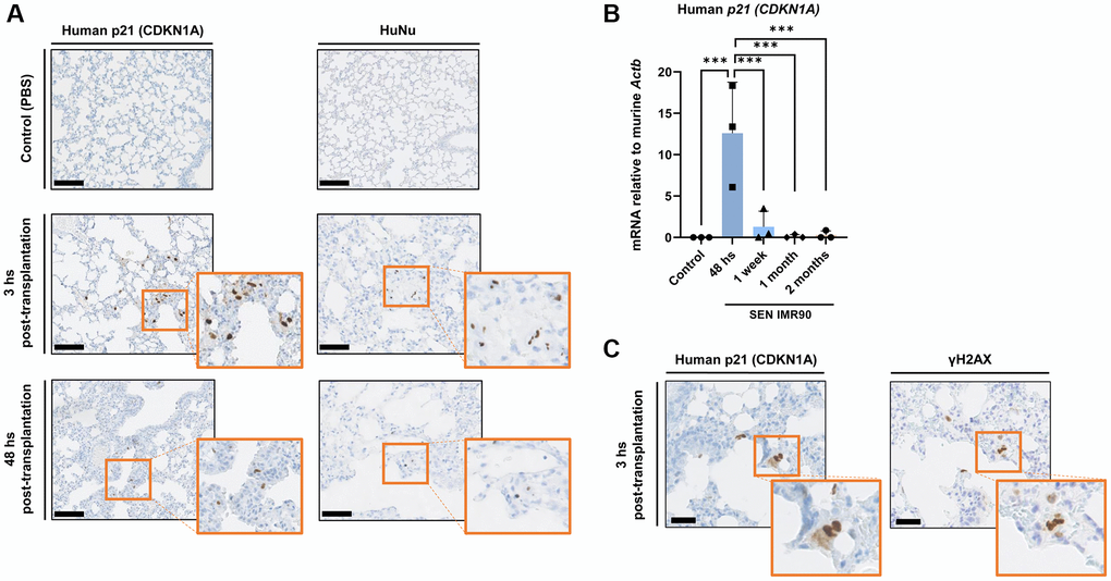 Based on the pro-fibrotic effects induced by SEN-IMR90 reported above, we explored if these cells can successfully engraft within the lung parenchyma of immunodeficient mice after instillation. We found that human senescent cells, as detected by staining with antibodies against human CDKN1A/p21Cip1/Waf1, a senescence marker, and Anti-Human Nuclear Antigen (HuNu), can be localized in the interstitium of mouse lungs 3 hours post-transplantation, and are still detectable 48 hours after instillation (Figure 2A). Similar observations were made when we measured human CDKN1A/p21Cip1/Waf1 mRNA levels (Figure 2B). We verified senescence in the engrafted cells by serial sectioning and staining with antibodies against human CDKN1A/p21Cip1/Waf1 and Phospho-H2AX (γ-H2AX) as a marker for DNA damage and genomic instability (Figure 2C).