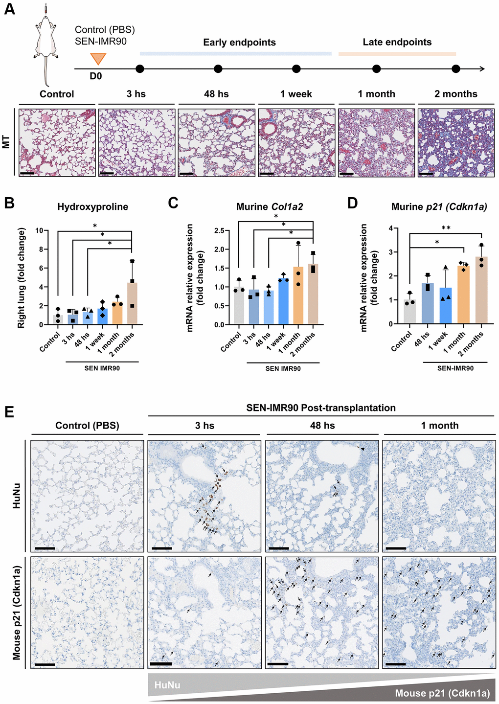 To explore how fibrosis evolves over time, we monitored the dynamics of lung fibrosis at different time points after SEN-IMR90 transplant, using PBS as a negative control (Figure 3A). We observed that, over time (up until 2 months after transplant), there was a progressive increase in several fibrotic markers including hydroxyproline content (Figure 3B), and mRNA levels of murine Col1a2 (Figure 3C) and the murine senescent marker Cdkn1a/p21Cip1/Waf1 (Figure 3D). This suggests that fibrosis initiated by senescent human cells evolves into murine senescence and fibrosis at late stages of disease. At the latest endpoint analyzed (two months post challenge), fibrosis content was compared to mice treated with a single dose of bleomycin [18, 19]. The levels of hydroxyproline content (Supplementary Figure 1A) and murine Col1a2 (Supplementary Figure 1B) and Cdkn1a/p21Cip1/Waf1 (Supplementary Figure 1C) mRNAs were similar in SEN-IMR90 transplanted animals compared to those treated with bleomycin. The increase in murine senescence was confirmed by immunohistochemistry, which showed high levels of p21-positive cells 1 month after instillation of human SEN-IMR90 cells (Figure 3E). This contrasted with the progressive elimination of the engrafted human SEN-IMR90 cells, which were essentially undetectable by qRT-PCR (Figure 2B) or by immunohistochemistry (Figure 3E) 1 month after intratracheal instillation. Therefore, senescent human lung fibroblasts initiate a process of fibrosis that is progressive and associated to an increase in senescent murine cells.