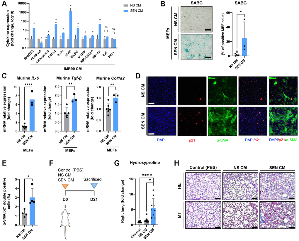 Then, to explore if human SASP factors released by SEN-IMR90 induce senescence in mouse cells, we incubated mouse embryo fibroblasts (MEFs) with CM derived from 6-day cultured SEN-IMR90 and confirmed that it does indeed trigger senescence in MEFs, as indicated by enhanced SABG staining (Figure 4B), and transcriptional upregulation of the profibrotic SASP components IL-6, Tgf-β and Col1a2 (Figure 4C). In addition, we detected by immunofluorescence the expression of CDKN1A/p21Cip1/Waf1 and the myofibroblast activation marker alpha smooth muscle actin (α-SMA) (Figure 4D). The amount of double positive α-SMA/p21 cells in MEFs treated with SEN-CM was significantly higher compared to those treated with NS-CM (Figure 4E). Finally, we observed that the instillation of SEN-CM to immunodeficient mice (Figure 4F) triggered a fibrogenic response 21 days after treatment, as indicated by augmented hydroxyproline levels (Figure 4G) and MT staining (Figure 4H).