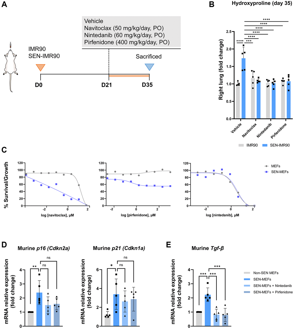 Twenty-one days after instillation of IMR90 or SEN-IMR90 in 6–8 weeks old male nude athymic (nu/nu) mice, treatment with navitoclax (50 mg/kg, oral gavage, 14 days), nintedanib (60 mg/kg, oral gavage, twice per day, 14 days; Boehringer Ingelheim), or pirfenidone (400 mg/kg, oral gavage, twice per day, 14 days; Roche), or vehicle was started, and mice were euthanized thereafter. The degree of pulmonary fibrosis was determined quantitatively by the concentration of lung hydroxyproline.