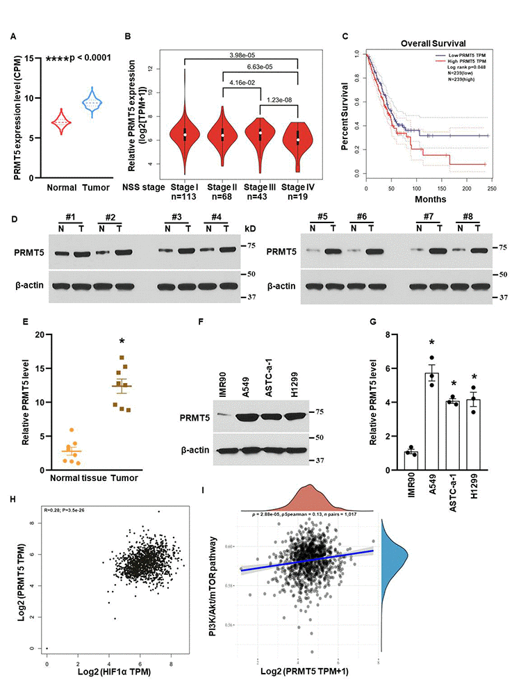 To define the biological functions of PRMT5 in lung cancer, we first evaluated the relative expression levels of PRMT5 in lung tumor tissues and normal tissues. As seen in Figure 1A, PRMT5 mRNA expression was much higher in lung tumor tissues than in normal tissues, indicating that PRMT5 is up-regulated in lung cancer. Next, we assessed the association of PRMT5 expression with the lung tumor stages. As seen in Figure 2B, PRMT5 expression was much higher in stage II, stage III, and stage IV than in stage I, and the ectopic expression levels of PRMT5 were positively correlated with the stages. Furthermore, the patients with high expression levels of PRMT5 had a low survival rate compared with the patients with low expression levels of PRMT5 (Figure 1C). To validate the above findings, we collected the eight paired-lung tumor tissues and normal tissues from the patients with lung cancer and the PRMT5 protein expression were determined by Western blotting. As seen in Figure 1D and 1E, PRMT5 protein expression levels were significantly elevated (4.4 fold) in tumor samples compared with normal samples. Additionally, we detected the PRMT5 protein expression in lung cancer cell lines and normal human fetal lung fibroblast cells (IMR90). Consistent with the above lung cancer tissue results, PRMT5 was overexpressed in lung cancer cells than IMR90 cells (Figure 1F, 1G). Previous studies showed that HIF-1α and PI3K/Akt signaling pathway was closely related to angiogenesis, metastasis, and EMT [20, 21]. We next assessed the correlation between PRMT5 and HIF-1α or PI3K/Akt signaling pathway. As seen in Figure 1H, 1I, we found that PRMT5 positively correlated with HIF-1α and PI3K/Akt signaling pathway in lung cancer, suggesting a potential association between these genes and pathways. Taken together, our findings indicate that abnormal expression of PRMT5 is closely related to the lung tumor stages and survival rates in patients with lung cancer, and PRMT5 may regulate angiogenesis, metastasis, and EMT through HIF-1α and PI3K/Akt signaling pathway.