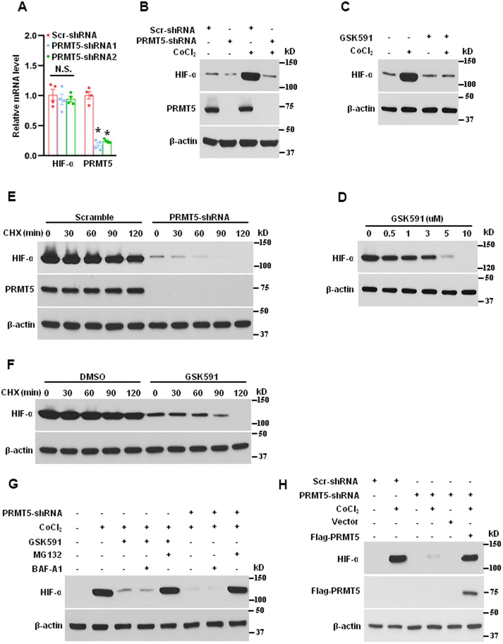 The ASTC-a-1 cells were obtained from the Department of Medicine, Jinan University (Guangzhou, China), and the cells were cultured in Dulbecco’s Modified Eagle’s Medium (1:1) (DMEM, Gibco, Thermo Fisher Scientific) supplemented with 10% (v/v) fetal bovine serum (FBS, Sigma cat# F2442), 50 units/ml penicillin, and 50 mg/ml streptomycin. The Human umbilical vein endothelial cells (HUVECs) were purchased from Thermo Fisher Scientific (cat# C0035C), and the cells were cultured in Endothelial Cell Growth Medium (EGM-2 BulletKit, Lonza, cat# CC-3162) supplemented with 10% FBS, L-glutamine, and 1% antibiotic solution. All other cell lines were purchased from The Cell Bank of Type Culture Collection of Chinese Academy of Sciences (CAS) in Shanghai and were cultured in Dulbecco’s Modified Eagle’s Medium (DMEM, Gibco, Thermo Fisher Scientific) supplemented with 10% fetal bovine serum. The mycoplasma was measured by PlasmoTest™-Mycoplasma Detection Kit (InvivoGen, China) in ASTC-a-1cells and HUVECs before the experiments were performed. All the cells were maintained at 37° C with 5% CO2 in an incubator. The ASTC-a-1 cells and HUVECs were treated with 200μM Cobalt Chloride (CoCl2) for indicated time points to generate the hypoxic cell model. PRMT5 specific inhibitor EPZ015666 (GSK3235025, cat# HY-12727) and MG-132 (HY-13259) was purchased from MedChemExpress (MCE). The cycloheximide (cat# C4859) and GSK591 were purchased from Sigma (cat# SML-1751). The lysosome inhibitor bafilomycin A1 (BAF-A1, cat# 1334) was purchased from TOCRIS.