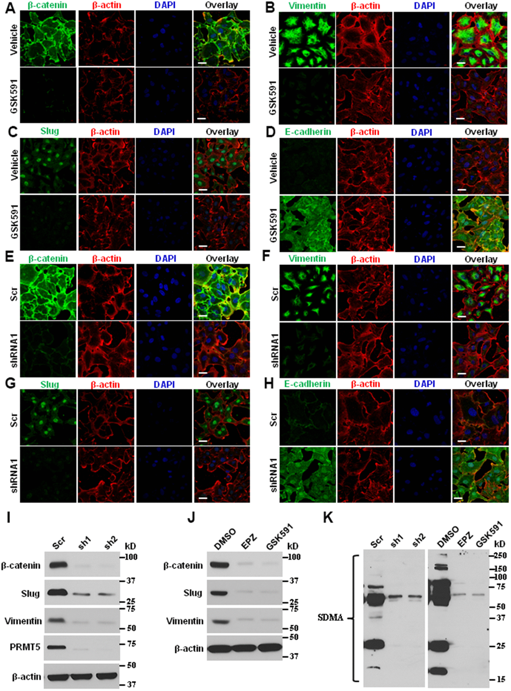 Angiogenesis is a critical component of metastatic signaling and EMT by recruiting new blood vessels, which provides the principal route to facilitate the tumor cells to secede from the primary tumor site and enter circulation [29]. To probe the molecular basis of EMT and metastasis in lung cancer cells mediated by PRMT5, the ASTC-a-1 cells were treated with PRMT5 inhibitor GSK591 or infected with lentivirus expressing PRMT5-shRNA, and the EMT markers were monitored by immunofluorescence. As seen in Figure 5A–5D, inhibition of PRMT5 significantly repressed the expression of β-catenin, Vimentin, and Slug, whereas the expression of E-cadherin was increased upon GSK591 treatment. Similar results were obtained in PRMT5 depletion cells (Figure 5E–5H). To confirm the above findings, these markers were also detected by Western blotting. As seen in Figure 5I and 5J, the expression levels of β-catenin, Vimentin, and Slug were diminished in response to PRMT5-specific inhibitors GSK591 and EPZ or down-regulation of PRMT5. The PRMT5 enzyme activity was also reduced, indicated by the expression of SDMA (Figure 5K). Altogether, our findings suggest that PRMT5 regulates lung cancer cell EMT and metastasis, at least in part, via promoting angiogenesis by controlling HIF-1α/VEGFR/Akt/eNOS signaling pathway.
