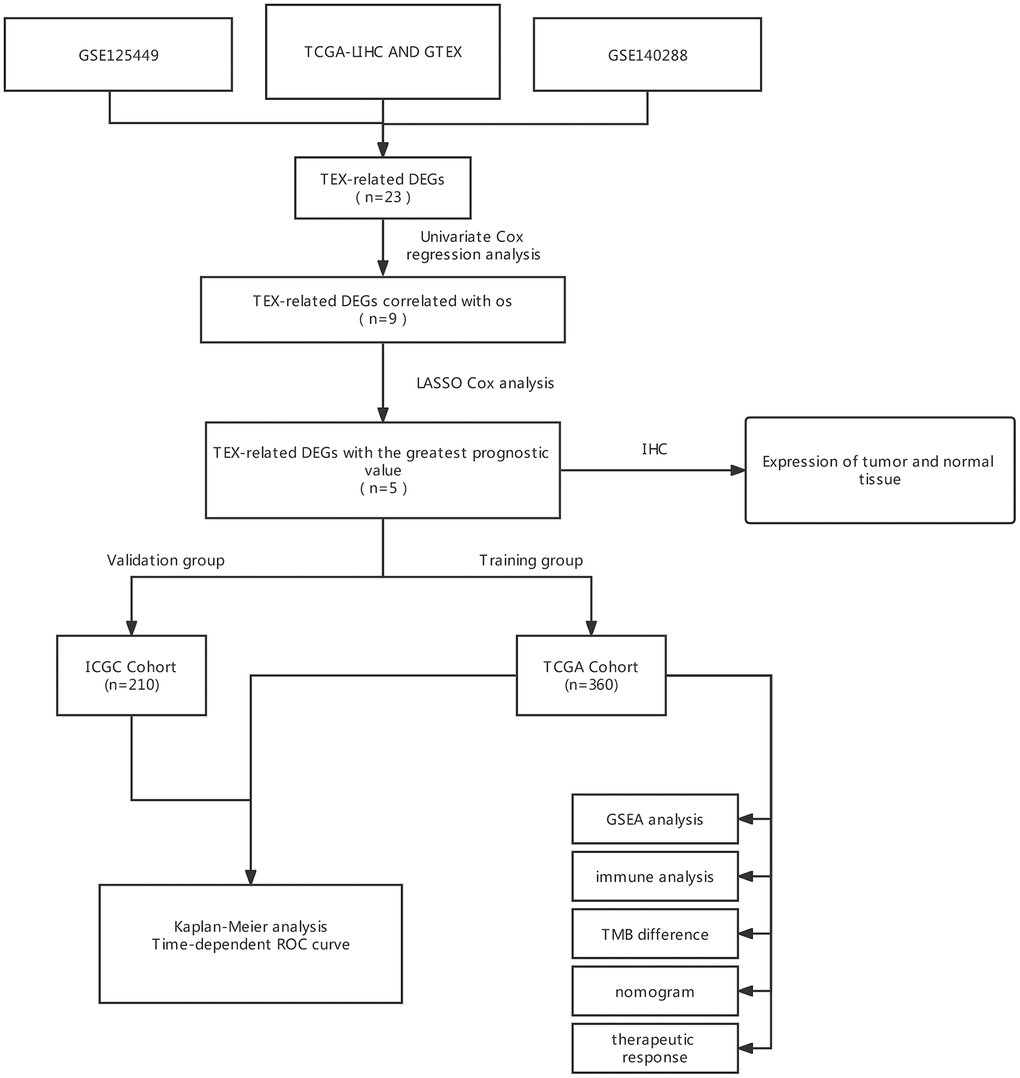 Gene expression and clinical data were retrieved from TCGA (https://portal.gdc.cancer.gov/), the ICGC and the GTEx database (https://xenabrowser.net/datapages/). The raw count data were firstly normalized with transcripts per million (TPM) method and underwent a log2 transformation. Two independent cohorts were employed in our research, with the TCGA-LIHC cohort (tumor: 377) used as a training dataset and the ICGC cohorts (tumor:260) used as a validation dataset. The TEX-related gene were obtained from two scRNA-seq datasets (GSE125449 and GSE140288) in the TISCH (http://tisch.comp-genomics.org/) [13]. P < 0.05 and |log2 FC| ≥ 1 were used as the thresholds for filtering TEX-related DEGs. Meanwhile, the clinical characteristics of TCGA and ICGC cohorts and TEX-related DEGs are presented in Supplementary Table 1.