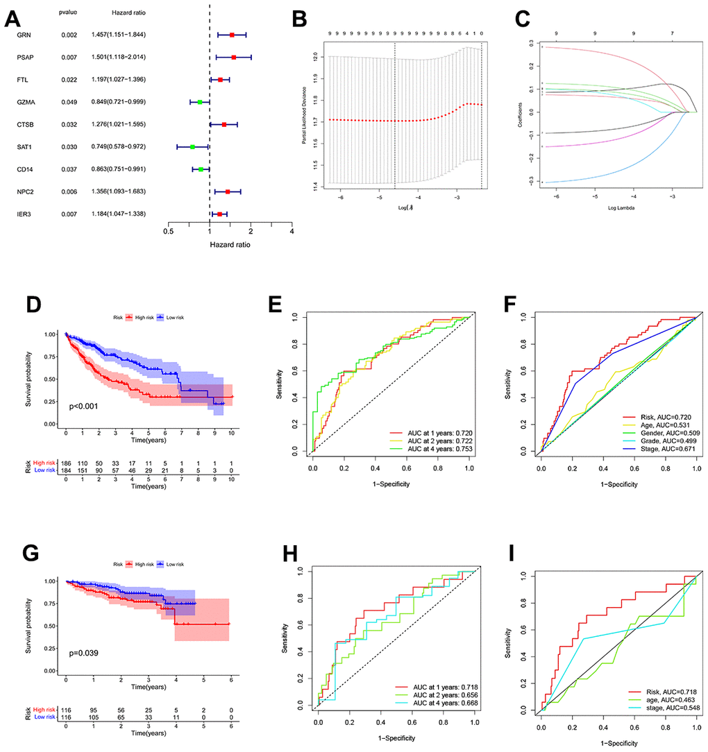 Additional research, multivariate Cox regression analysis, and LASSO regression revealed that five genes (FTL, GZMA, CD14, NPC2, and IER3) were prognostic markers that were used to construct a TEXPM (Figure 3B, 3C). On the training and test team, the prognostic performance of the TEXPM was validated using the KM survival curve and log-rank test. On the basis of the median risk score, each case was classified as either high- or low-group. Based on KM analysis, the presence of the high-TEXPM group was associated with a lower likelihood of survival in the TCGA and GTEx cohorts (P < 0.001, Figure 3D). For1, 2 and 4- year survival rates, the AUC predictive value of the TEXPM was 0.720, 0.722 and 0.753 (Figure 3E). Furthermore, the AUC value for TEXPM was substantially greater than those for age, sex, tumor stage, and pathological stage (Figure 3F). Similar to the TCGA findings, the majority of new TEXPM identified in this analysis were negatively associated with the risk model in the test group. (P = 0.0039; Figure 3G) The existence of a high- TEXPM group was related to a decreased likelihood of survival. The AUC predictive value of the TEXPM for 1, 2 and 4- year survival rates was 0.718, 0.661 and 0.669 (Figure 3H).