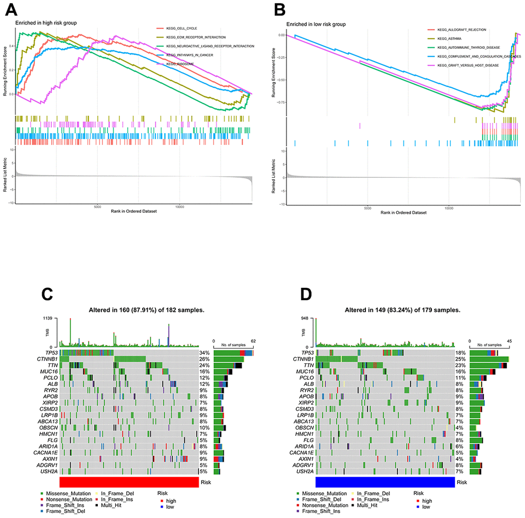 GSEA was used to identify enriched GO gene sets in the two TEXPM groups, detailed GSEA results are in Supplementary Table 2. The GSEA plot only showed the top five routes. The gene sets of the low-TEXPM group were enriched in immune-related self-limiting disease pathways, whereas the high-TEXPM group was enriched in cell cycle and cancer-related pathways (Figure 5A, 5B). When the high- and low-TEXPM groups were analyzed for gene mutations, we found that TP53 accounted for the largest proportion and that TP53 was more frequent in the high-TEXPM group than in the low-EXPM group (Figure 5C, 5D). As shown in Supplementary Figure 2. we analyzed the correlation between the TEXPM score and TMB. Although not statistically significant (r = 0.077, P = 0.15), Kaplan-Meier analysis showed that the presence of high-risk TEXPM and high TMB groups was associated with a reduced likelihood of survival (P < 0.001).