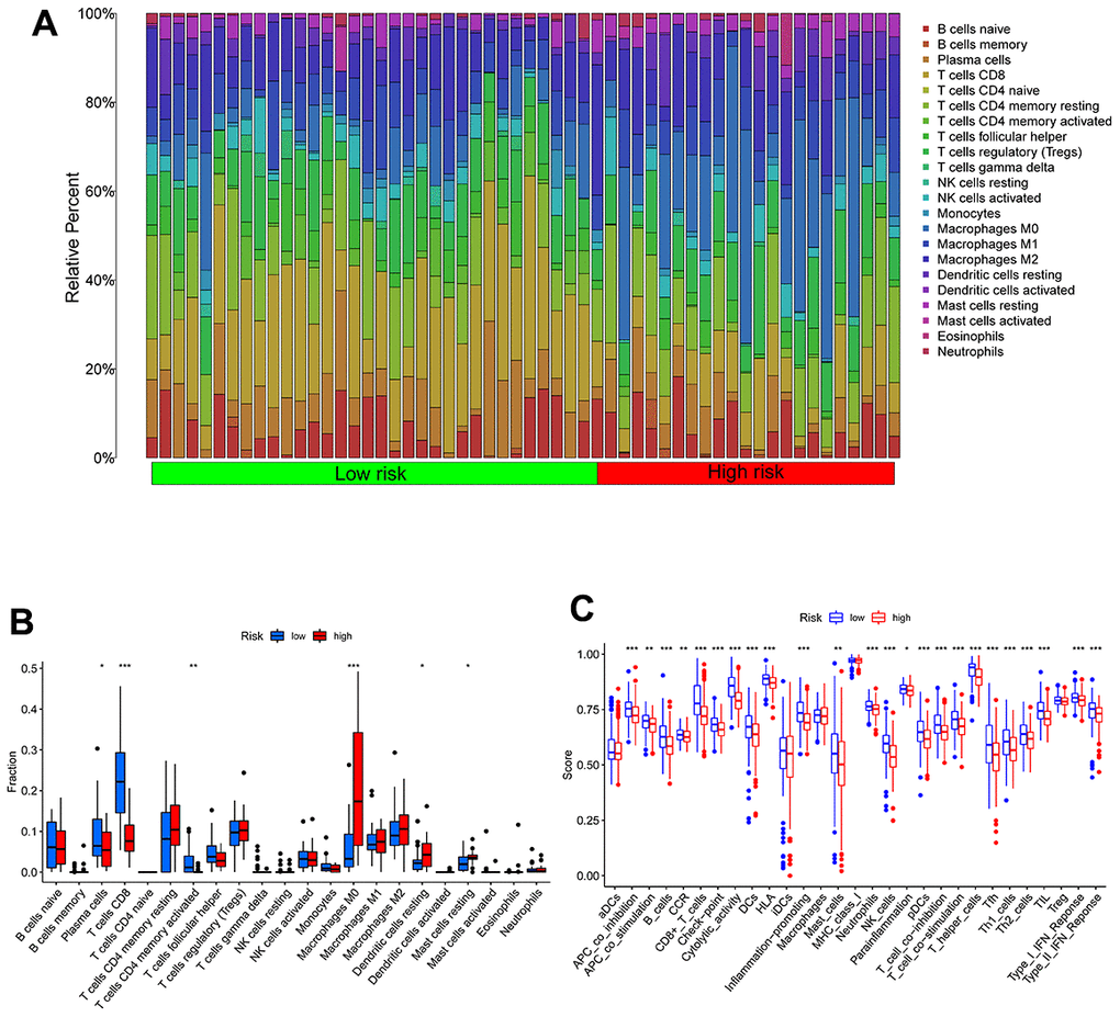 All statistical analyses and visualizations were carried out utilizing R software version 3.6.3 (https://www.r-project.org/). In the analysis of gene expression between tumor tissues and adjacent nontumorous tissues, a Student’s t-test was employed. The Chi-squared test was utilized to assess differences in proportions. To compare the ssGSEA scores of immune cells or pathways between the high-risk and low-risk groups, the Mann-Whitney test was performed, with P values adjusted using the Benjamini-Hochberg (BH) method. The comparison of OS between different groups was conducted using Kaplan-Meier analysis with the log-rank test. Independent predictors of OS were identified through univariate and multivariate Cox regression analyses. Unless otherwise specified, a P value less than 0.05 was considered statistically significant, and all P values were two-tailed.