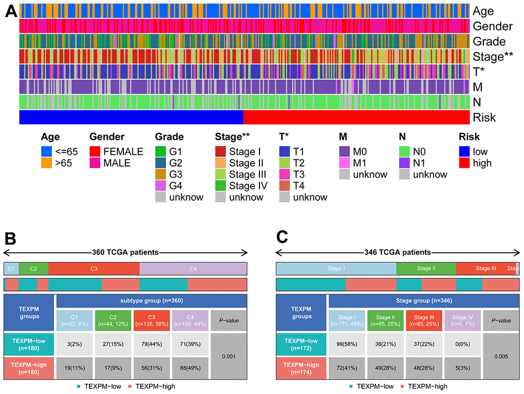 Figure 7A shows the clinical features in high- and low-TEXPM groups. In Figure 7B, the high TEXPM group was more predominant at the level of immune subtype C1 and immune subtype C4, while the low TEXPM group was more predominant at the level of immune subtype C2 and immune subtype C3 (P = 0.001). In Figure 7C, Specifically, In Stage I, the low-TEXPM group accounted for 58% of the total low-TEXPM group, while in Stages II, III, and IV, high-TEXPM groups totaled 59% of the total high-TEXPM group (P = 0.005).
