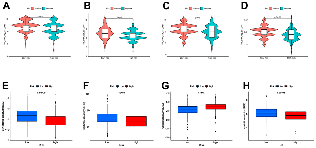 The IPS file received from TCIA was utilized to see if TEXPM expression may predict the immunotherapy response of HCC patients [23]. The IPS was obviously greater in the low-TEXPM group, indicating that immunotherapy would be more effective in patients with the low-TEXPM group (Figure 8A–8D). Next, we selected chemotherapeutic agents, reviewing the drugs currently used to treat LIHC to assess the sensitivity of these drugs in both groups of patients. We found that IC50 values for Imatinib, Bortezomib, and Tipifarnib were lower in patients with low TEXPM, while IC50 values for Axitinib were significantly lower in patients with high TEXPM (Figure 8E–8H).