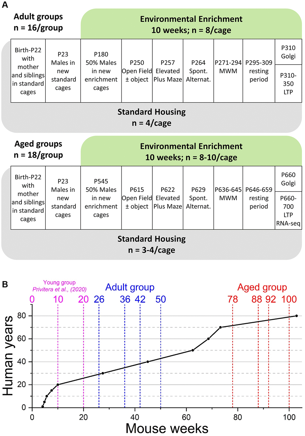 Aged groups were composed of 8 males in enriched cages and 4 in standard cages. Similarly, Aged groups were composed of 8–10 males in enriched cages and 3, 4 in standard cages (Figure 1).
