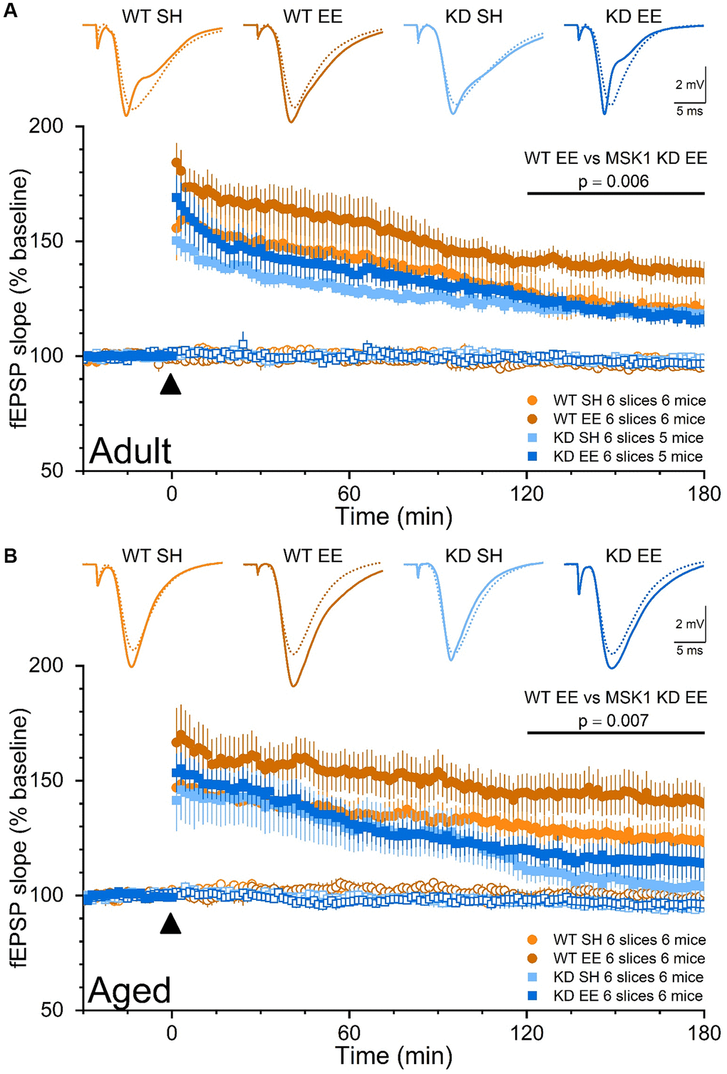 In Aged mice (Figure 10B), LTP in standard-housed mice was different between mutants and WT mice, with LTP returning to baseline within 3 hrs in MSK1 KD mice, but not in WT mice, where robust LTP was observed. A facilitation of LTP was seen after enrichment in MSK1 KD mice but failed to reach statistical significance above that of the standard-housed MSK1 KD mice. In contrast, the duration and extent of the enrichment-induced facilitation of LTP was much more pronounced in WT mice. These observations of enhanced LTP, especially in Aged enriched WT mice, may contribute to the enhanced performance in spatial memory tasks seen in these mice, while the LTP deficit and lack of appreciable facilitation of LTP in the MSK1 KD mice are likely factors in their poor performance on these tasks.