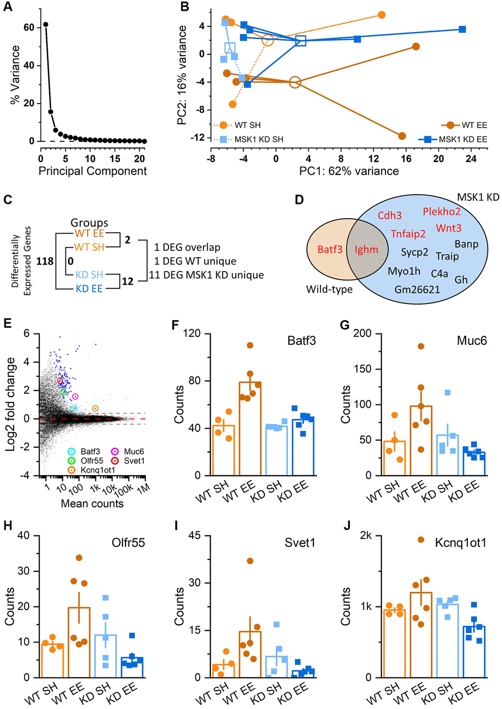 MSK1 regulates gene expression, including through the phosphorylation of CREB and histone H3 [40]. Since we previously observed an experience- and MSK1-dependent homeostatic downregulation of key MAPK signalling and plasticity-related genes and proteins in response to enrichment [36], we conducted an RNA-Seq analysis of gene expression in the hippocampi of Aged standard-housed and enriched WT and MSK1 KD mutant mice, since Aged mice benefitted most from the enrichment protocol. A principal component (PC) analysis (Figure 11A, 11B) revealed that the majority of the variance in gene expression (78 %) was captured by two PCs – PC1 (62 %) and PC2 (12%; Figure 11A). While there was overlap across the four groups particularly in PC1, PC2 separated WT enriched mice from the other three groups (Figure 11B). An analysis of differential gene expression (differentially-expressed gene; DEG) between the groups (Supplementary Data 1–7) showed that there were no DEGs between WT and MSK1 KD standard-housed animals, two DEGs between the two WT groups, and twelve DEGs between the two MSK1 KD groups (Figure 11C). Of these DEGs, one (Batf3) was unique and up-regulated in enriched WT animals; one (Ighm) was common to both and upregulated in enriched mice of both genotypes, and eleven were unique to the MSK1 KD mutant (Figure 11D). Of these eleven, seven were downregulated by enrichment and four were upregulated (Figure 11D).