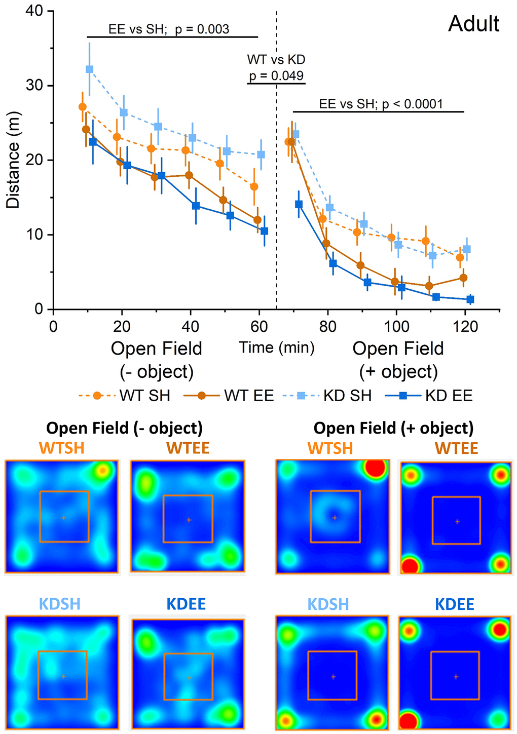Ten weeks of environmental enrichment in Adult mice had tangible effects on behaviour. This was evident in the open field arena where enriched mice of both genotypes (WT and MSK1 KD) demonstrated less exploratory behaviour compared to their standard-housed counterparts. This was true for both the open field and open field + object components of the test, as we had previously observed in young (~4 months) mice raised form birth in enrichment [36], and by others in adult and aged rodents [76–79], and may be due to faster habituation to novelty by enriched animals [80, 81]. However, a genotype-dependent effect was observed upon exposure to the object, with reduced locomotor activity in the Adult MSK1 mutant mice (which was not seen previously in young mice). It is possible that the salience or potential threat posed by this object was not appreciated by the MSK1 KD mice, rendering them less inclined to increase motor activity in response.