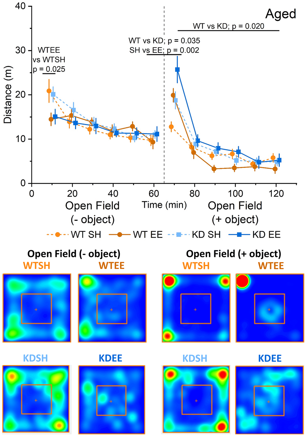 As expected, Aged mice travelled less in the open arena, and the difference between enriched and standard-housed mice was only apparent within the first 10 mins of the trial. The lack of a clear differential thereafter (as per the Adult and young mice) could reflect a floor effect in generally lower levels of locomotion and physical activity in Aged animals [23]. Introduction of the object initially provoked increased locomotion in all groups except the standard-housed WT mice. The reasons for this are unclear, but could reflect a blunted response to salient stimuli in standard-housed Aged WT mice vs. increased anxiety-like behaviour in standard-housed Aged MSK1 mutant mice, and increased curiosity of the Aged enriched mice. This may be the case since the heatmaps suggested approaches to the object in the enriched mice. Thereafter in the open field + object phase only the enriched WT mice showed reduced locomotor activity, a pattern seen in young [36] and Adult enriched WT mice. This suggests that in Aged mice introduction of the object was capable of discriminating between the enriched genotypes, and may reflect a particular anxiety-like phenotype in the MSK1 mutant mice not completely ameliorated by enrichment.