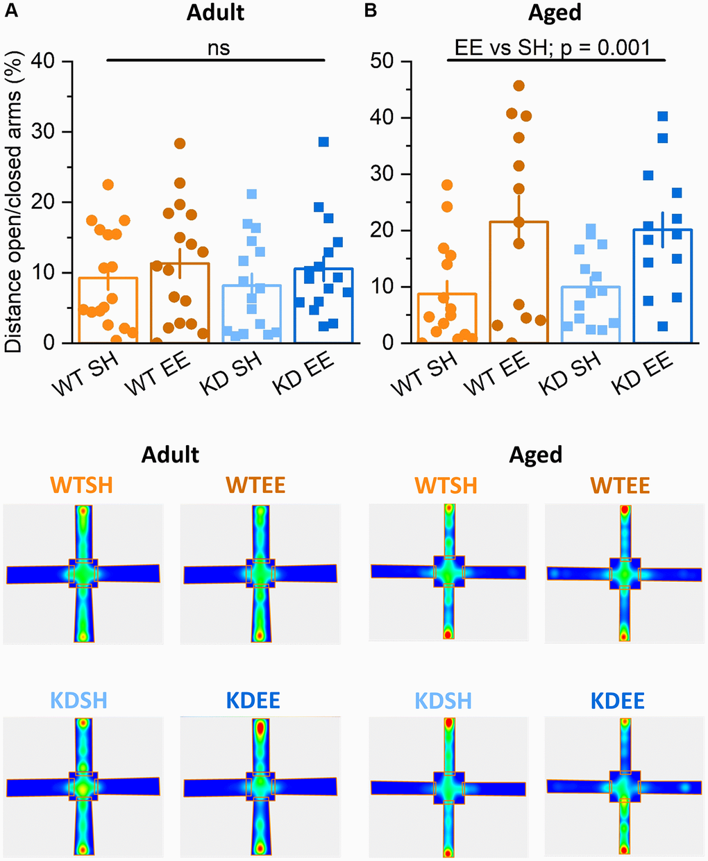 In the elevated plus maze test for anxiety-like behaviour, there was no influence of genotype or housing on the behaviour of Adult mice in terms of distance travelled (Figure 4A) or time spent (Supplementary Figure 1C) in the open arms. In contrast, Aged mice of both genotypes raised in the enriched environment travelled further (Figure 4B) and spent more time (Supplementary Figure 1D) in the open arms of the elevated plus maze. This likely reflects reduced anxiety-like behaviour, a classic effect of environmental enrichment [55], and was also seen in a previous study of younger enriched WT and MSK1 KD mice [36]. These observations confirm the effectiveness of the enrichment protocol in influencing behaviour in both Adult and Aged WT and MSK1 mutant mice, but reveal age- and experience-dependent differences on locomotion (Adult > Aged) and anxiety-like behaviour (Aged > Adult).