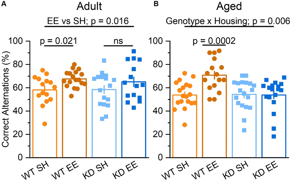 To assess hippocampus-dependent forms of spatial working memory we first employed a spontaneous alternation task, which has been shown to be a reliable tool to assess mutant mice with neurological conditions [56, 57]. While Adult standard-housed mice of both genotypes performed at comparable levels, there was a significant effect of enrichment, with enriched mice making more correct alternations, an effect that was statistically more pronounced in enriched WT mice (Figure 5A). In the Aged mice, the influence of genotype and housing on spatial working memory was even more stark, with a clear genotype x housing interaction in which the benefits of enrichment were only observed in the enriched WT mice (Figure 5B). These data suggest that the benefits of enrichment on spatial working memory becoming increasingly dependent on MSK1 as ageing progresses.