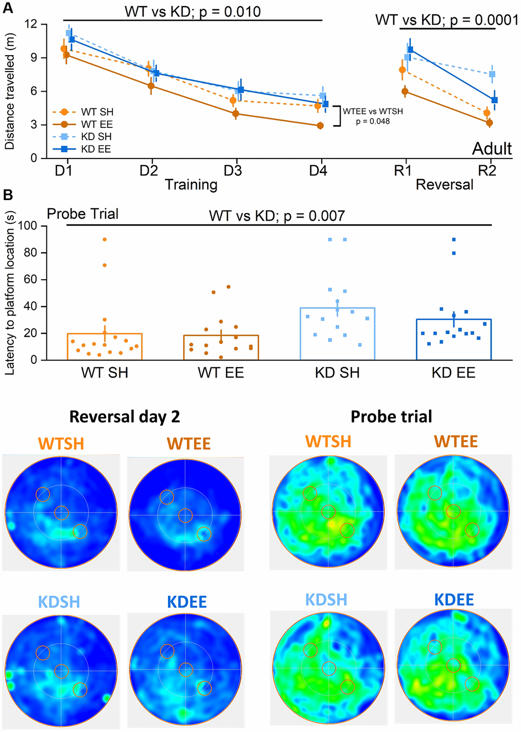 In the Adult groups during the learning (Training) phase of the water maze the WT mice performed better than the MSK1 KD mice (Figure 6A). While there was no genotype x housing interaction, enriched WT mice performed significantly better than standard-housed WT mice, whereas no such differential was observed between the MSK1 mutant mice. Similarly, when a Reversal learning stage was carried out after the learning phase, WT mice performed better than the MSK1 KD mutant mice (Figure 6A). A more detailed between factors statistical analysis showed that, while there was no significant genotype x housing interaction, the difference between enriched WT and MSK1 KD mice was highly significant indicating that enrichment benefited WT mice more than the MSK1 KD mutants in this test of cognitive flexibility. Measurements of the latency to the platform location during the Training and Reversal phases were consistent with those obtained with distance travelled (Supplementary Figure 2C). A similar genotype effect, where the WT outperformed the MSK1 KD mice, was also seen in the Probe trial for memory persistence administered 24 hrs later (Figure 6B).