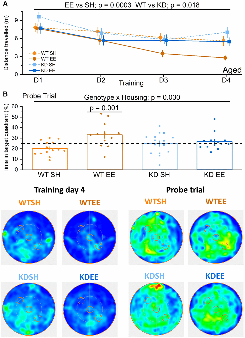 To investigate a more cognitively demanding form of hippocampus-dependent spatial memory, we used the Morris water maze task. To allow for a direct comparison across the ages of mice, we accounted for the reduced swimming speed of the Aged groups when compared to younger mice (Supplementary Figure 2A, 2B) by analysing the distance swum, rather than the time taken to reach the escape platform. We also limited trial exposure to 90 s, as opposed to the usual 120 s [36], to avoid the possibility of fatigue or hypothermia in Aged mice. As a further control for the sensorimotor abilities in the Adult and Aged mice we also ran a visual test before starting the learning stage to assess the ability of mice to see visual cues, a basic function upon which spatial memory relies, and their motivation to escape from immersion. This, together with the previous habituation stage, ensured that all mice were proficient swimmers and had experience in swimming and navigating to a platform before the learning session started. Accordingly, all mice of both age groups performed proficiently and similarly on the visual cue task, with no differences between the groups (data not shown). The absence of performance biases across genotypes, housing, and ages thus precluded confounds associated with different levels of sensorimotor ability, anxiety, motivation or fatigue.