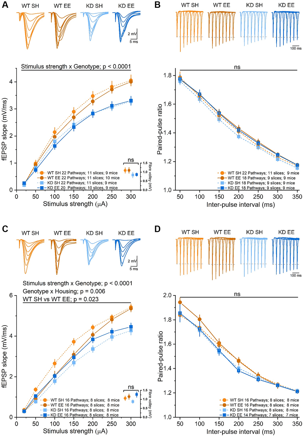 Given the deficit in basal synaptic transmission observed in MSK1 KD mice, care was taken to match the baseline strength of synaptic transmission, which involved adjusting the stimulus intensity to yield fEPSPs of ~3 mV across all groups. Electrophysiological recording parameters and the analysis of fEPSPs were under the control of WinLTP program [117]. Experiments were interleaved and performed blind to the identity and housing condition of the mice, which was revealed only after the experiments had been analysed, with genotype confirmed with post-hoc genotyping as required.