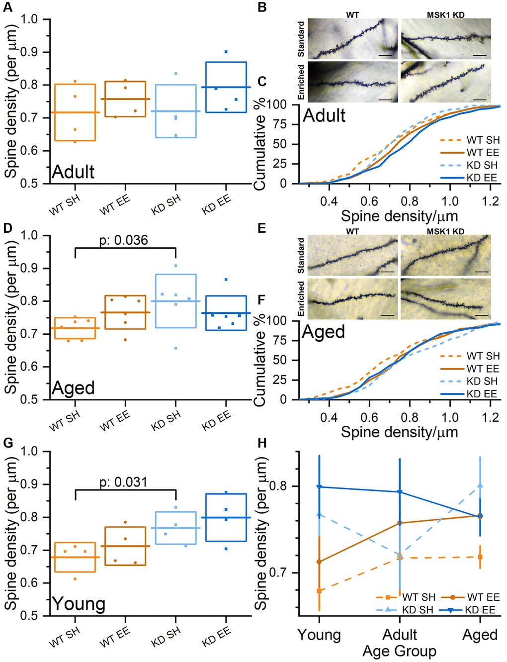 To confirm that the deficit in synaptic transmission, which has also been observed in the medial perforant path input to granule cells in the dentate gyrus in MSK1 knockout mice [59], was not due to a reduction in the density of dendritic spines, upon which excitatory synapses on CA1 neurons are located, we performed an age-, housing condition- and genotype-blind analysis of dendritic spines in stratum radiatum of Golgi-stained CA1 pyramidal neurons (Figure 9). Comparing the mean spine density in individual animals indicated that spine density is similar to (Figure 9A–9C; Adult mice), or indeed greater in MSK1 KD mice compared to WT mice (Figure 9D–9F; Aged mice), replicating observations made previously in younger mice (Figure 9G) [34, 36]. A comparison of CA1 stratum radiatum spine density across the lifespan (Figure 9H) demonstrated that, for the most part, standard-housed MSK1 mutant mice had greater spine density than their WT counterparts, and that enrichment enhanced spine density in both groups, most consistently in WT mice. This suggests that MSK1 is not required for the spine density increase provoked by enrichment. The data also suggest that MSK1 is either required for the pruning of dendritic spines, or that the elaboration of dendritic spines is a compensatory mechanism for reduced synaptic strength at individual spines.