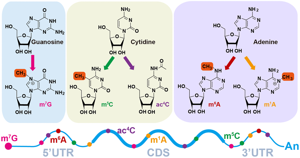As is well known, RNAs play an essential role in the translation process, gene regulation, and environmental interactions [1]. Chemical modification is a highly specific and effective method for regulating the functions of biological macromolecules. These macromolecules can be covalently modified after synthesis, such as RNA, DNA, protein, lipids, carbohydrates, and polysaccharides [2]. RNA modification not only has dynamic reversibility but can also be regulated by a wide range of factors, which has led to the emergence of the term “RNA epitranscriptome” and has become increasingly popular in recent years [3]. Recently, more than 100 RNA modification types on bases or ribose have been discovered within all types of RNA, including ribosome RNA (rRNA), transfer RNA (tRNA), messenger RNA (mRNA) and non-coding RNA (ncRNA), which have been confirmed to be involved in many diseases and bio-processes [2, 4, 5]. For example, various RNA modifications in mRNA like N6-methyladenosine (m6A) [6], N4-acetylcysteine (ac4C) [7], N7-methyl guanidine (m7G) [8], 5-methylcytidine (m5C) [9] and N1-methyladenosine (m1A) [10] (Figure 1), are conducive to RNA metabolism steps including splicing, translocation, transcript stability and translation in eukaryotic cells, especially m6A [11]. NAT10 (RNA acetyltransferase)-mediated ac4C can promote mRNA’s stability by extending the mRNA’s half-life in Hela cells [12]. In addition, METTL1-dependent m7G on pre-let-7 regulates pre-let-7 and let-7 expression levels and lung cancer cell migration [13]. Interestingly, even when targeting the same type of methylation, the sets of methyltransferases and demethylases, acting as writers and erasers respectively, can vary across different types of RNA species [14].