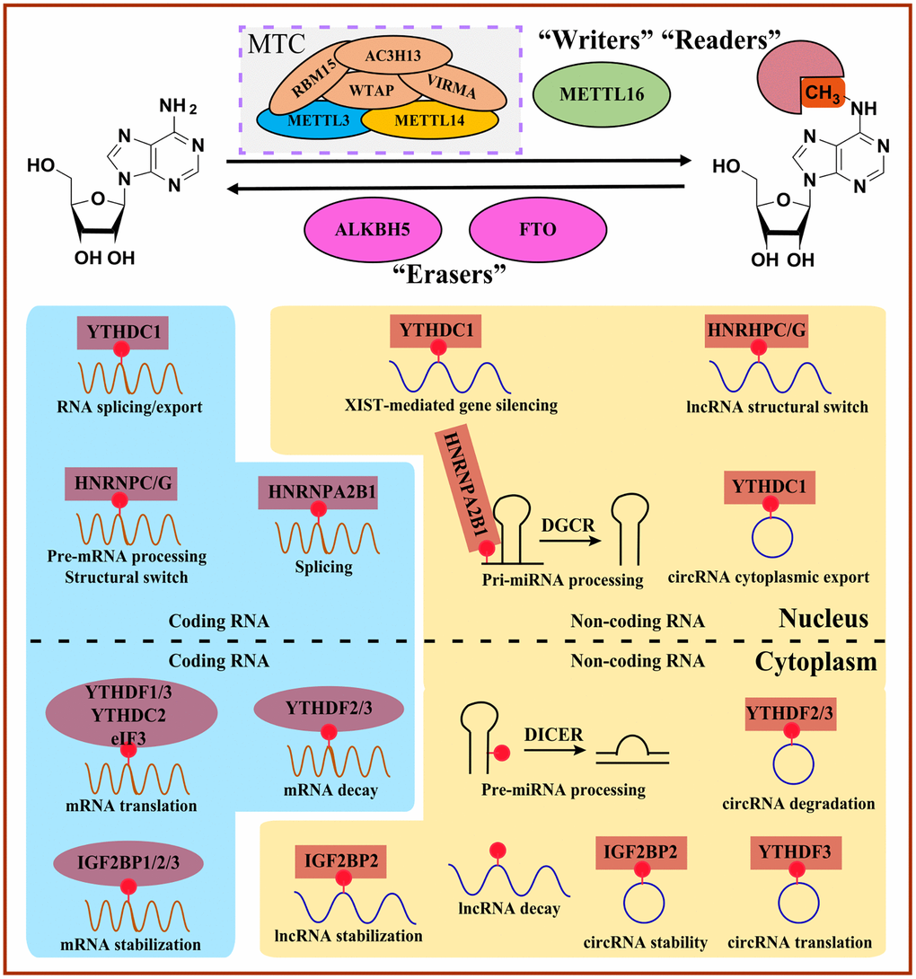 m6A modification can be recognized by the translation initiation factor eukaryotic initiation factor 3 (eIF3), heterogeneous nuclear ribonucleoproteins (HNRNPs), insulin-like growth factor 2 mRNA-binding proteins (IGF2BPs), and proteins containing the YT521B homology (YTH) domain. In addition, specific m6A readers may mediate different physiological processes, such as immune response and biological rhythm, and participate in RNA metabolism steps such as RNA degradation and translation by binding the m6A modification site directly [11, 31, 32].